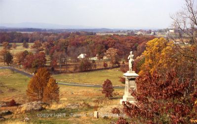 This is a view from Little Round Top with the Pennsylvania State Monument in the Distance on the far upper right..